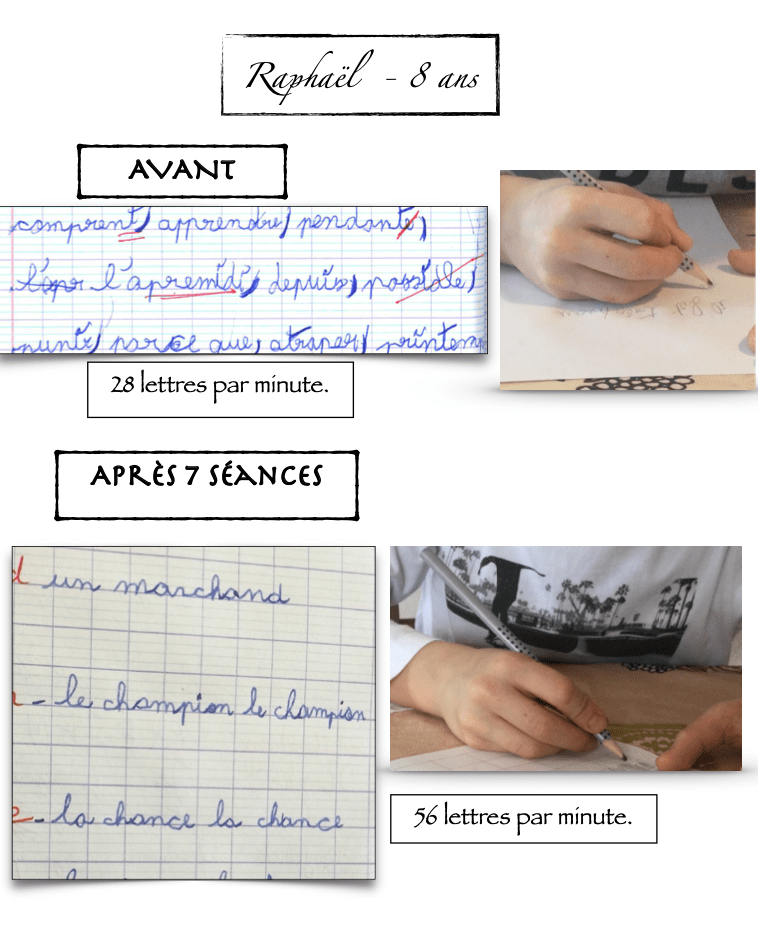 En quelques séances, les élèves réalisent des progrès visibles. Ils retrouvent le goût de l’écriture ainsi qu’un réel confort au niveau de la main et du poignet. L’objectif est de retrouver de l’aisance, de la lisibilité et de la vitesse.